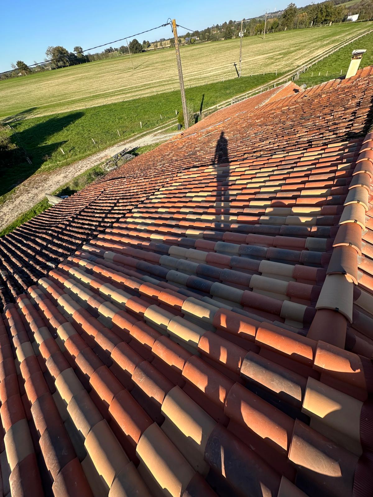 Le client souhaitait préserver sa toiture existante — une demande que nous rencontrons souvent sur le bâti ancien, où l’objectif reste de conserver l’ouvrage en place plutôt que d’engager un remplacement total. La toiture se composait de tuiles canal en terre cuite (les fameuses tuiles « en S », caractéristiques de la région bordelaise), fortement colonisées par mousses et lichens, avec quelques tuiles fissurées çà et là.